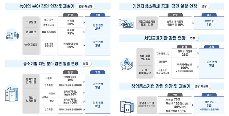 먼저 농·수산업의 소비급감과 경제여건 악화가 지속됨에 따라 농·어업 분야의 취득세와 재산세 감면이 3년 연장되고 중소기업 지원 분야 감면과 개인지방소득세 공제·감면도 일괄 연장한다.