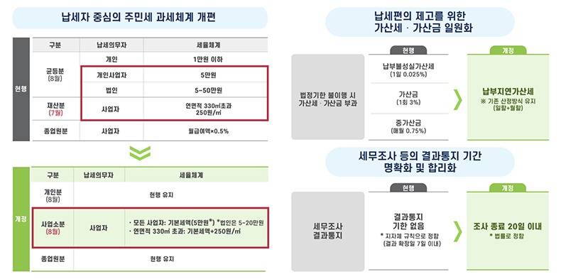 특히 납세편의를 위해 주민세 과세체계를 전면 개편하고 납부불성실가산세와 가산금도 ‘납부지연가산세’로 일원화한다.