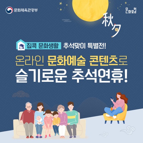 이번 ‘슬기로운 추석 문화생활’은 집콕 문화생활의 추석특집기획으로 연휴 기간 동안 볼거리, 즐길거리를 ▲전통·민속 ▲가족·어린이 ▲공연·영상 ▲전시·체험·행사 등 주제별로 선별해 새롭게 제공한다.